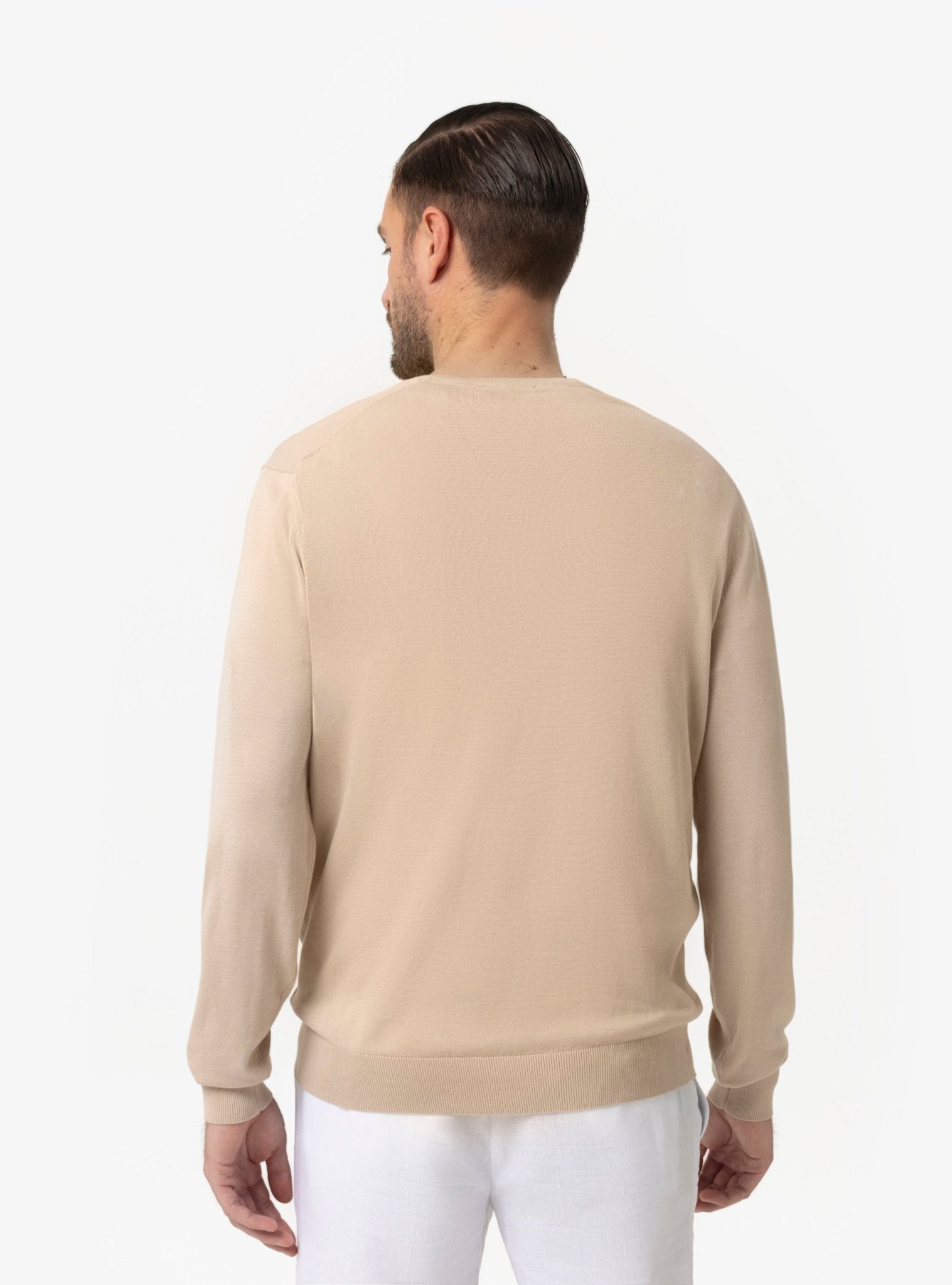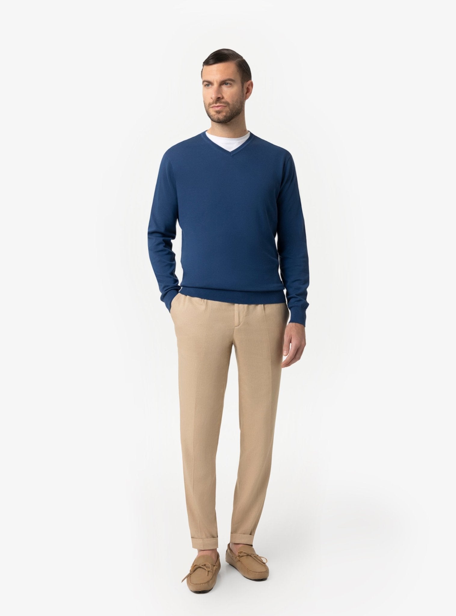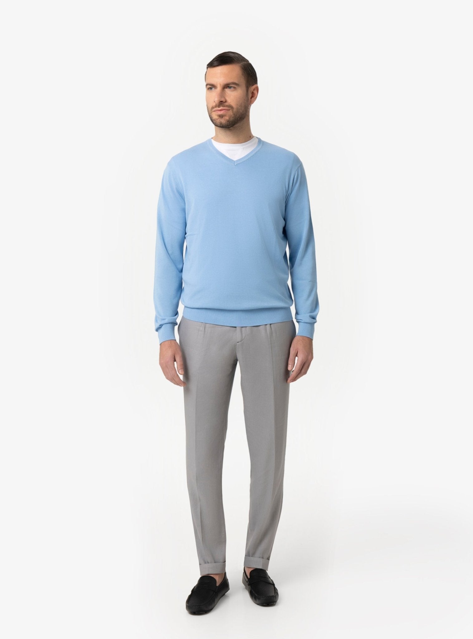 La maglia scollo V rappresenta una scelta strategica nel guardaroba maschile primaverile ed estivo. La sua struttura minimal valorizza la figura con discrezione, mentre l’apertura a V sul collo slancia visivamente il busto, creando un effetto elegante e armonico. È un dettaglio distintivo che consente di giocare con le sovrapposizioni, lasciando intravedere una t-shirt o una camicia leggera per un risultato curato ma naturale.